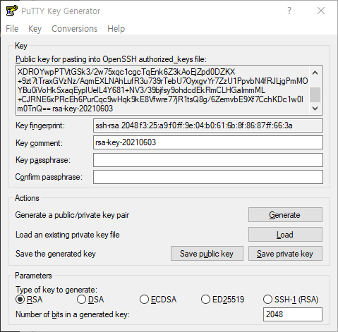 먼저 인증에 사용할 Key를 PuttyGen을 사용하여 생성해 준다.