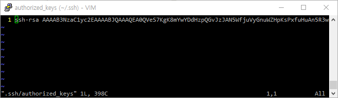 Key 생성 시 저장해뒀던 Public key를 Raspberry Pi의 home 디렉터리 내에 저장한다. (VIM 에디터 사용)