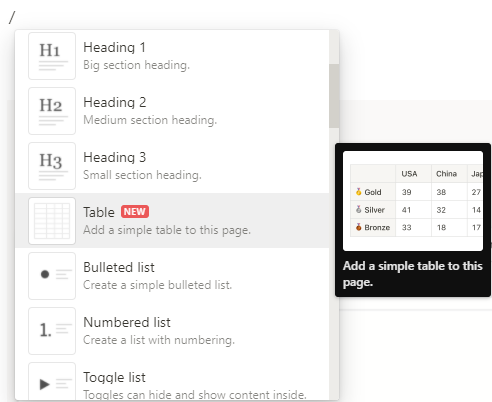 오늘도 업무 관련 내용을 정리하던 중 블록을 작성하려고 슬래시(/)를 눌렀는데 New라고 쓰여진 새로운 블록 기능을 발견했다.