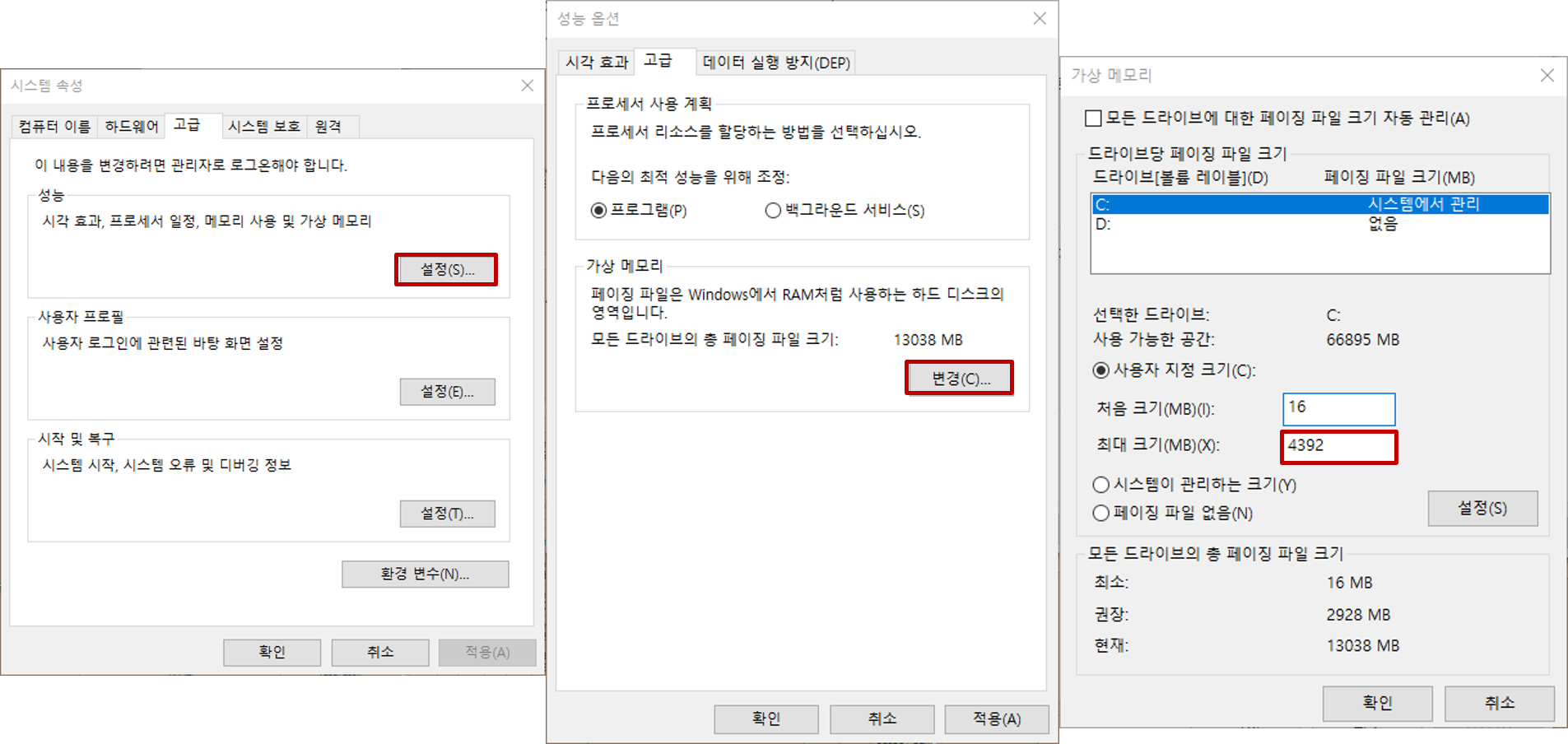 내 PC 설정 -> 고급 시스템 설정에서 페이징 크기를 권장 크기의 1.5배로 다시 설정해 주었다. (4392 (MB))