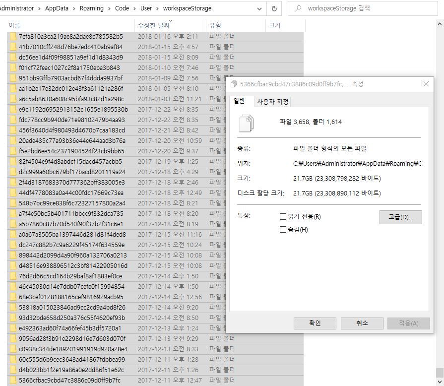 다음으로 용량이 큰 부분을 확인해보니, AppData 내 Roaming 데이터와 Cache 데이터이다.
