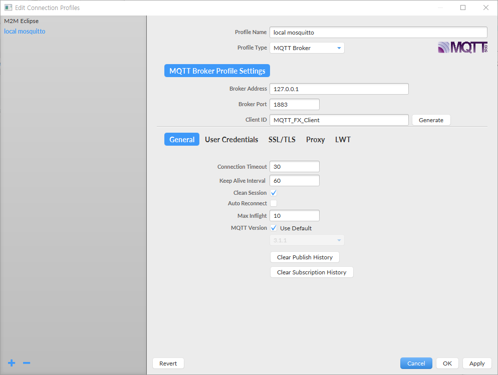 MQTT.fx 설치 직후 profile을 확인해 보면 아래와 같이 기본 profile이 2개 있는 형태이다.