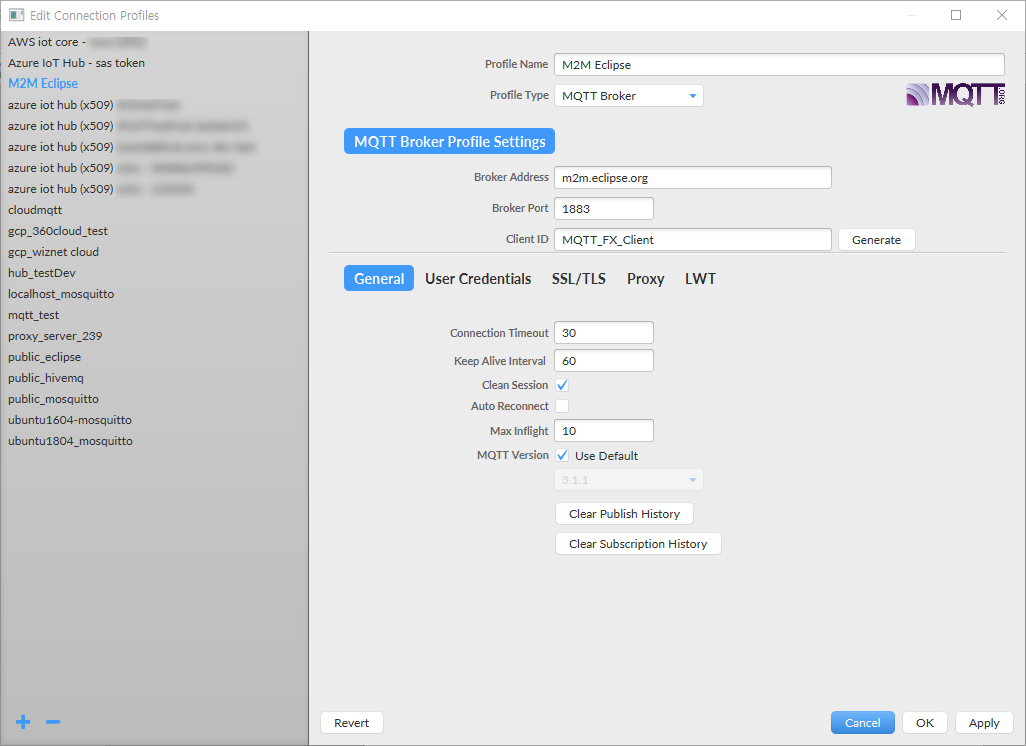 이제 다시 MQTT.fx를 실행하면 기존 설정이 모두 복원되어 있는 것을 볼 수 있다.