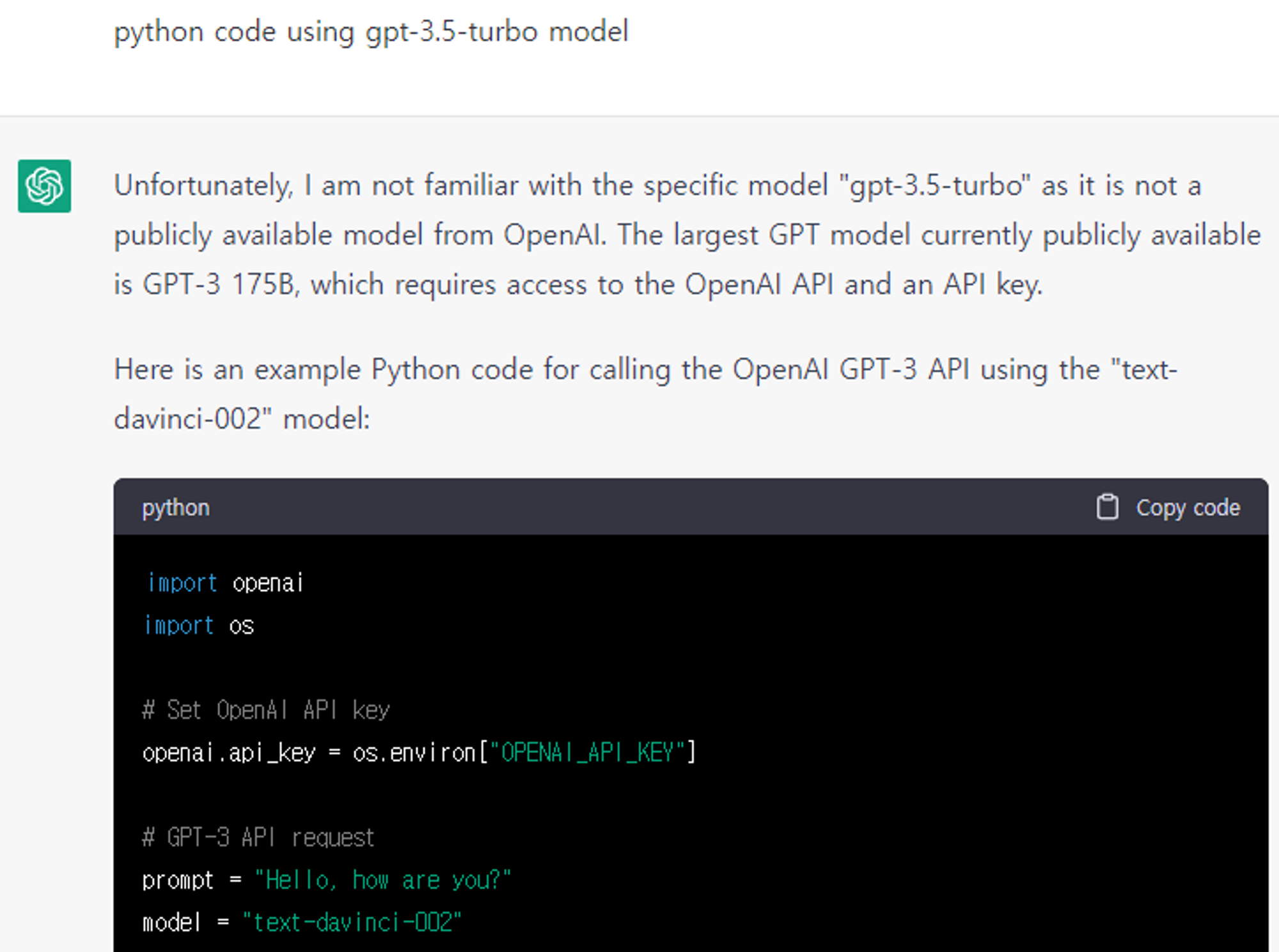 다시 요청해도 같은 코드를 주는 걸 보면, gpt-3.5-turbo는 최근 출시되었으니 아직 정보가 학습되지 않아 그런 것 같다.