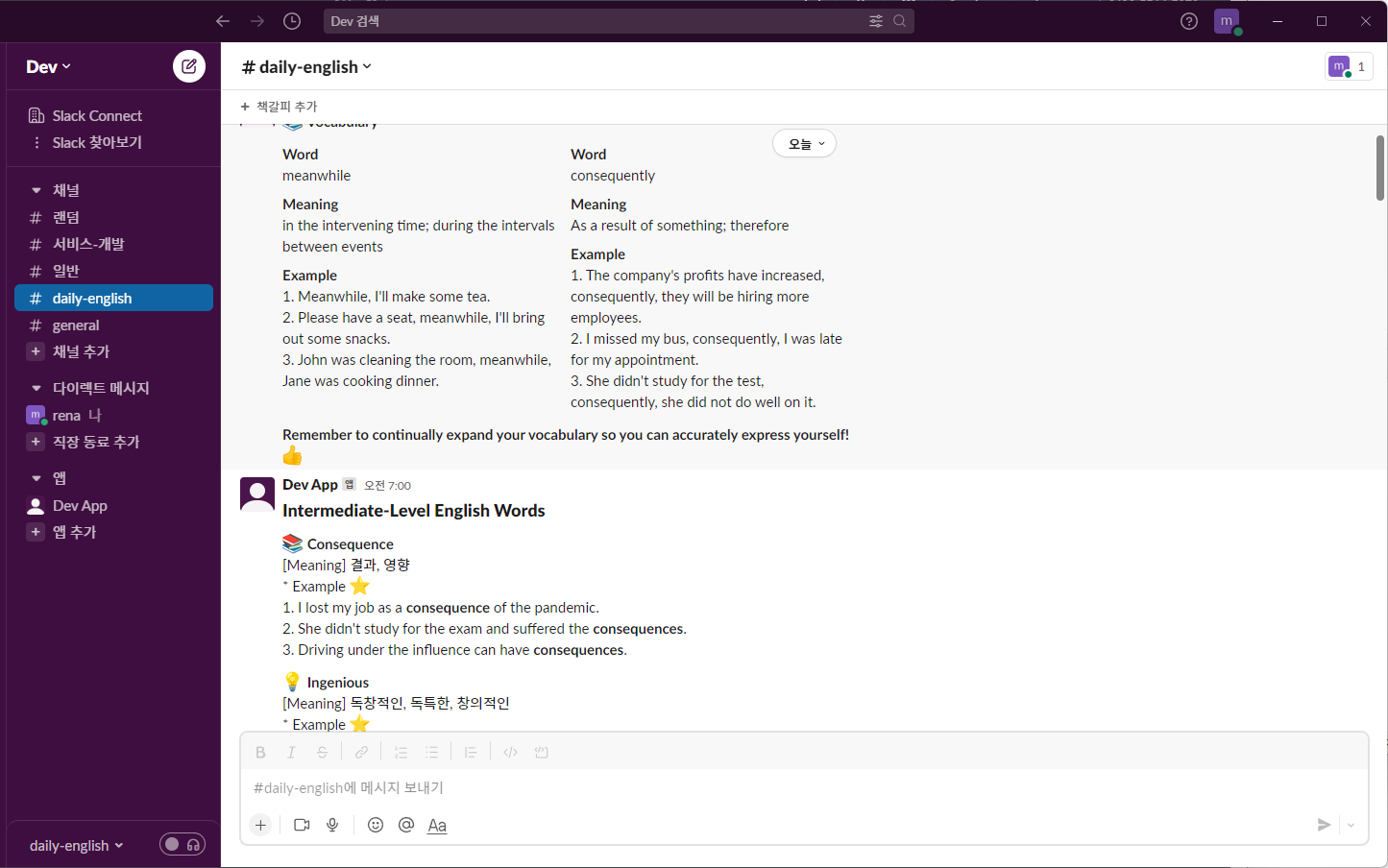처음에는 #general 채널로 게시하다가, #daily-english로 생성 후 그 채널로 계속 게시하고 있다.