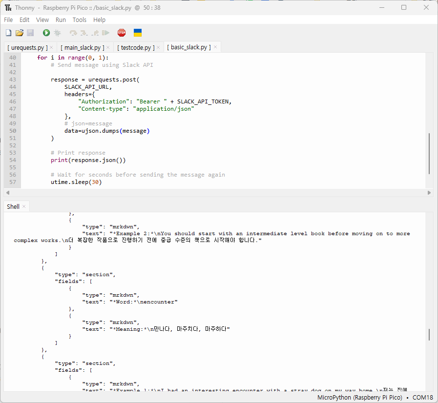 W5100S-EVB-Pico 보드 환경에서 Slack 및 ChatGPT API를 사용하려면 마이크로 컨트롤러용으로 설계된 Python의 경량 구현인 Micropython과 호환되도록 Python 코드를 수정해야 한다.