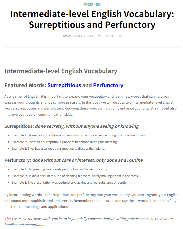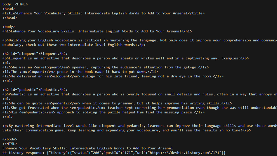 ChatGPT API와 Tistory API를 연동하여 영어 학습 프롬프트를 생성한 후에는 Tistory 블로그에 생성된 게시물을 검토합니다.
