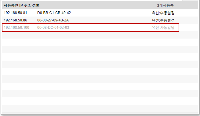 보드가 연결된 공유기에서 내가 설정한 맥 주소와 할당된 IP 주소를 확인할 수 있다.