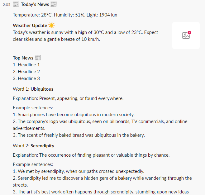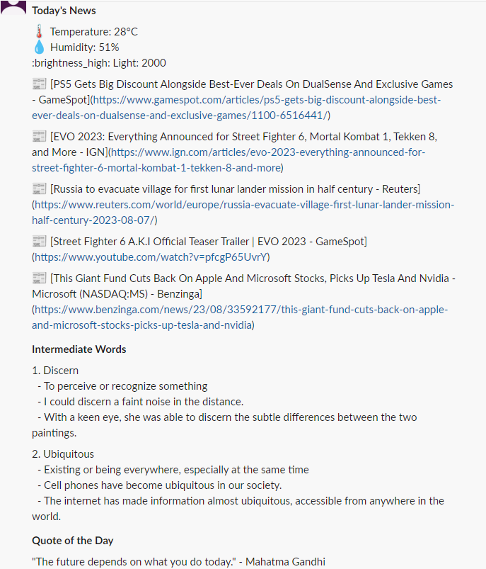 user_text = f'Temperature: {dht11.temperature()}, Humidity: {dht11.humidity()}, Light: {ldr.read_u16()}, {news_str}'