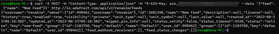 curl -X POST -H "Content-Type: application/json" -H "X-AIO-Key: <key>" --data '{"feed": {"name": "New Feed"}}' http://io.adafruit.com/api/v2/<username>/feeds