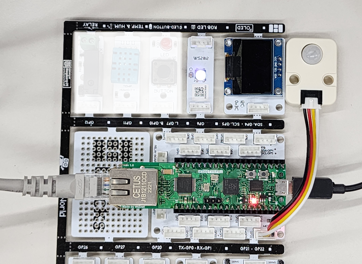 모션을 인식하기 위해 PIR 센서를 사용했는데, M5Stack의 Unit 모듈이 있어서 이를 Picobricks에 GROVE 케이블로 연결해서 사용했다. 점퍼 케이블보다 연결이 간편하다.